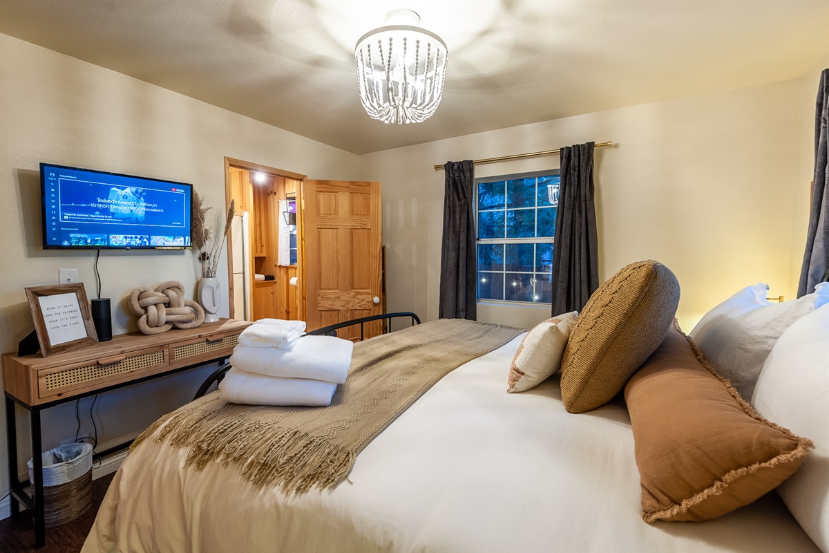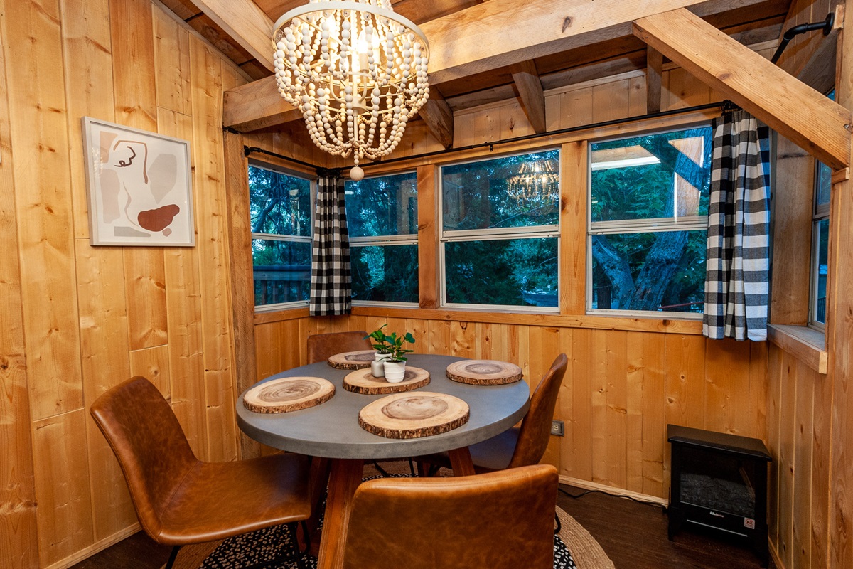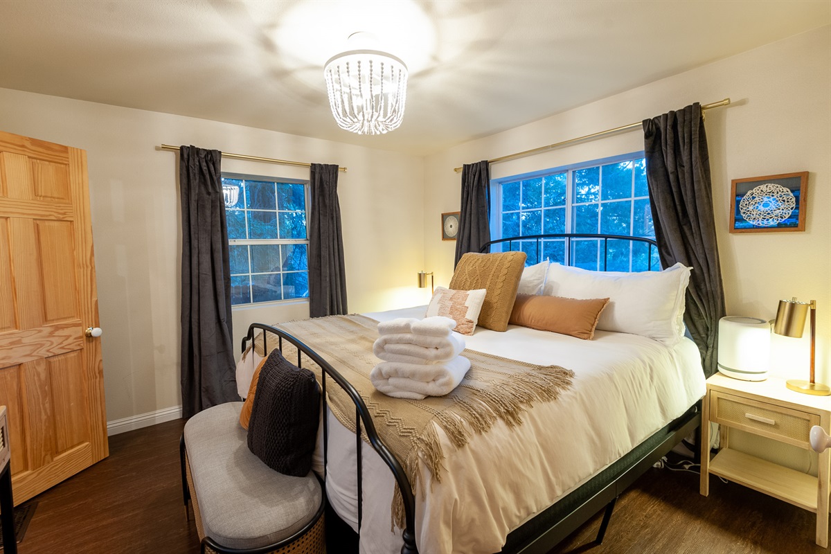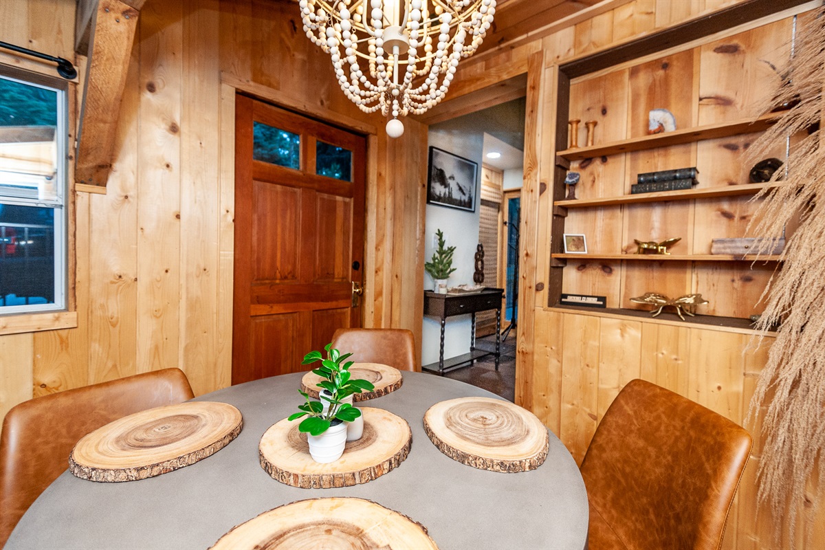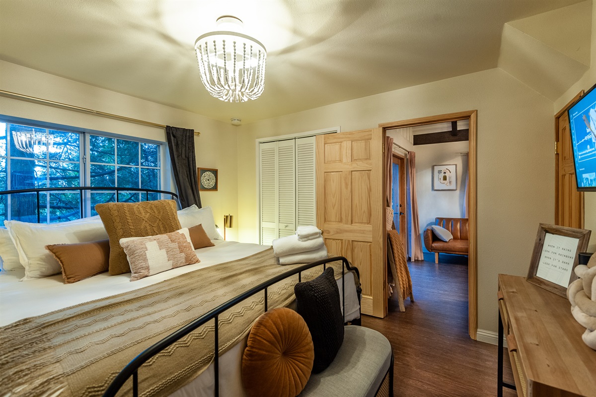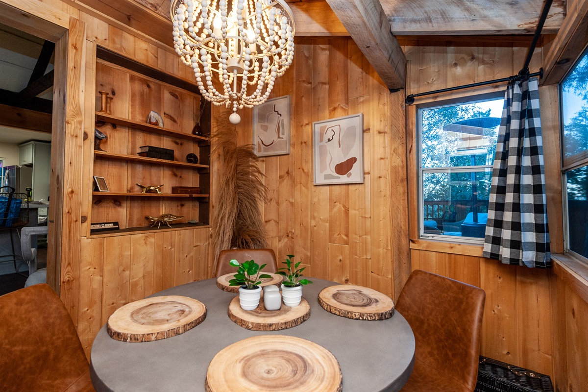 4 Bedrooms • 3 Bathrooms 3 Baths • Sleeps 1-8Relax and unwind at Cedar Pines, our stylish 1928 Cabin in the woods, which has been recently renovated with Mid-Century Modern decor. Our cabin is family friendly and is equipped with all of your needs in mind. The cabin is a 4 bedroom, 3 bath with 3 decks surrounded by beautiful trees. Our home is fully gated and has privacy fencing to enclose the property. We also have curated the most comfortable bedding and decor. We have combined the nostalgia of a mountain cabin with modern amenities to keep you in the present and make the cabin more sustainable by utilizing LED lighting, solar power where possible and avoiding disposable materials as much as we can. This serene cabin is an ideal get away for the whole family and makes a great home base for all of the activities Lake Arrowhead and San Bernardino Mountain resorts have to offer. There is shopping, restaurants, and outdoor activities throughout our mountain community. Lake Arrowhead Village is a 10 minute drive.